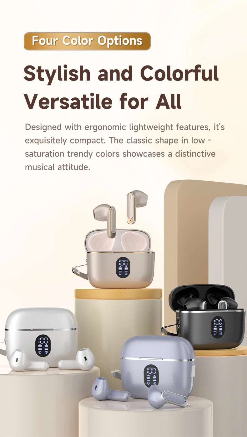These earbuds also feature an LED display that shows battery status for both the earbuds and the charging case, keeping you informed about power levels at a glance. The ergonomic in-ear design provides comfort during extended wear while maintaining a secure fit for workouts, commuting, or casual listening.